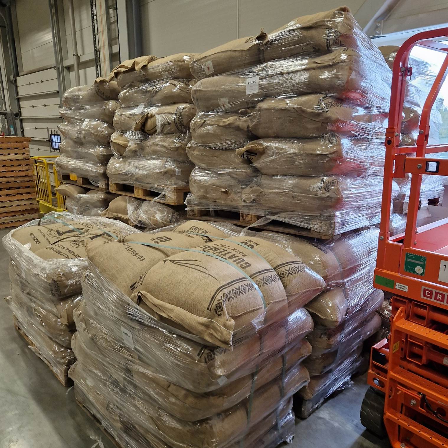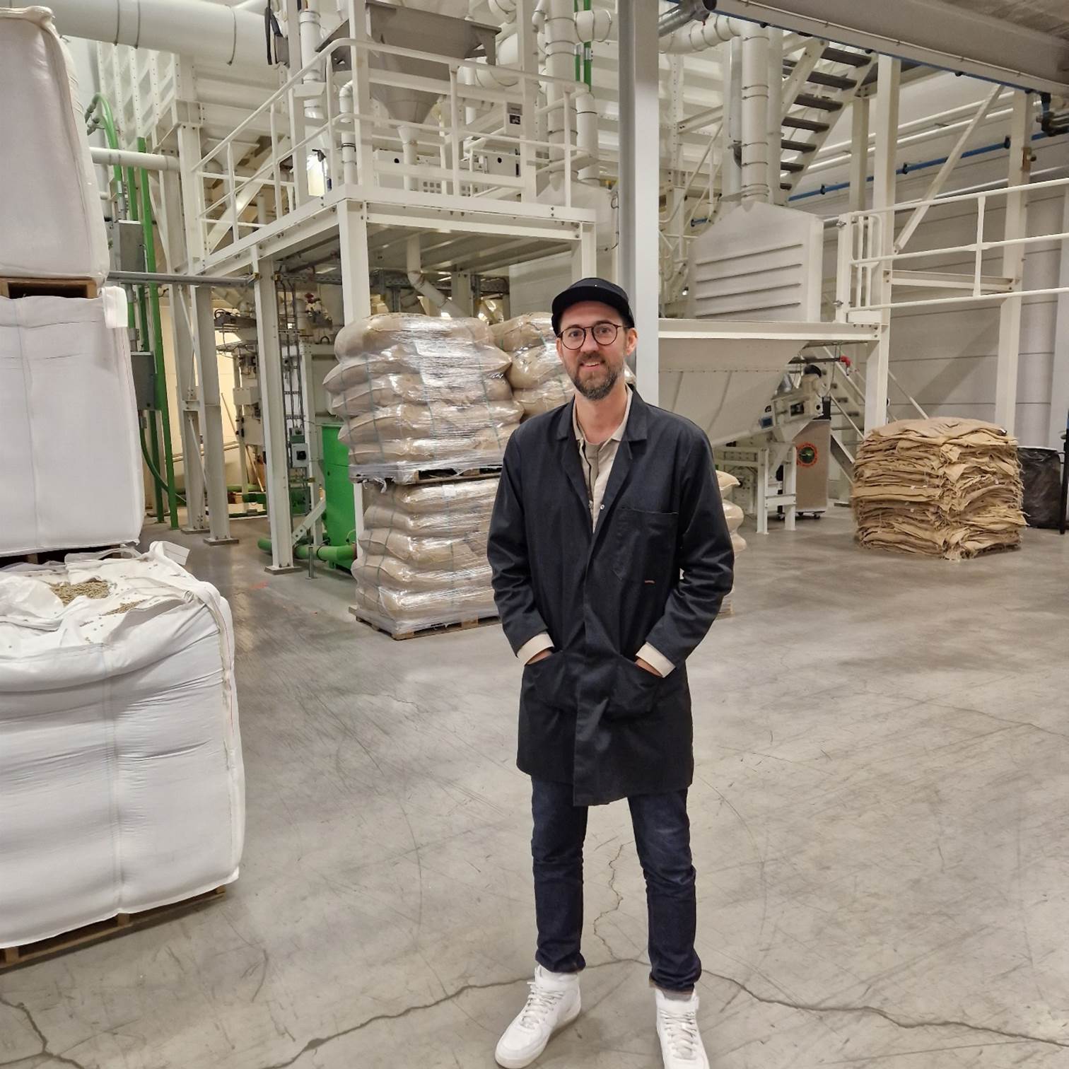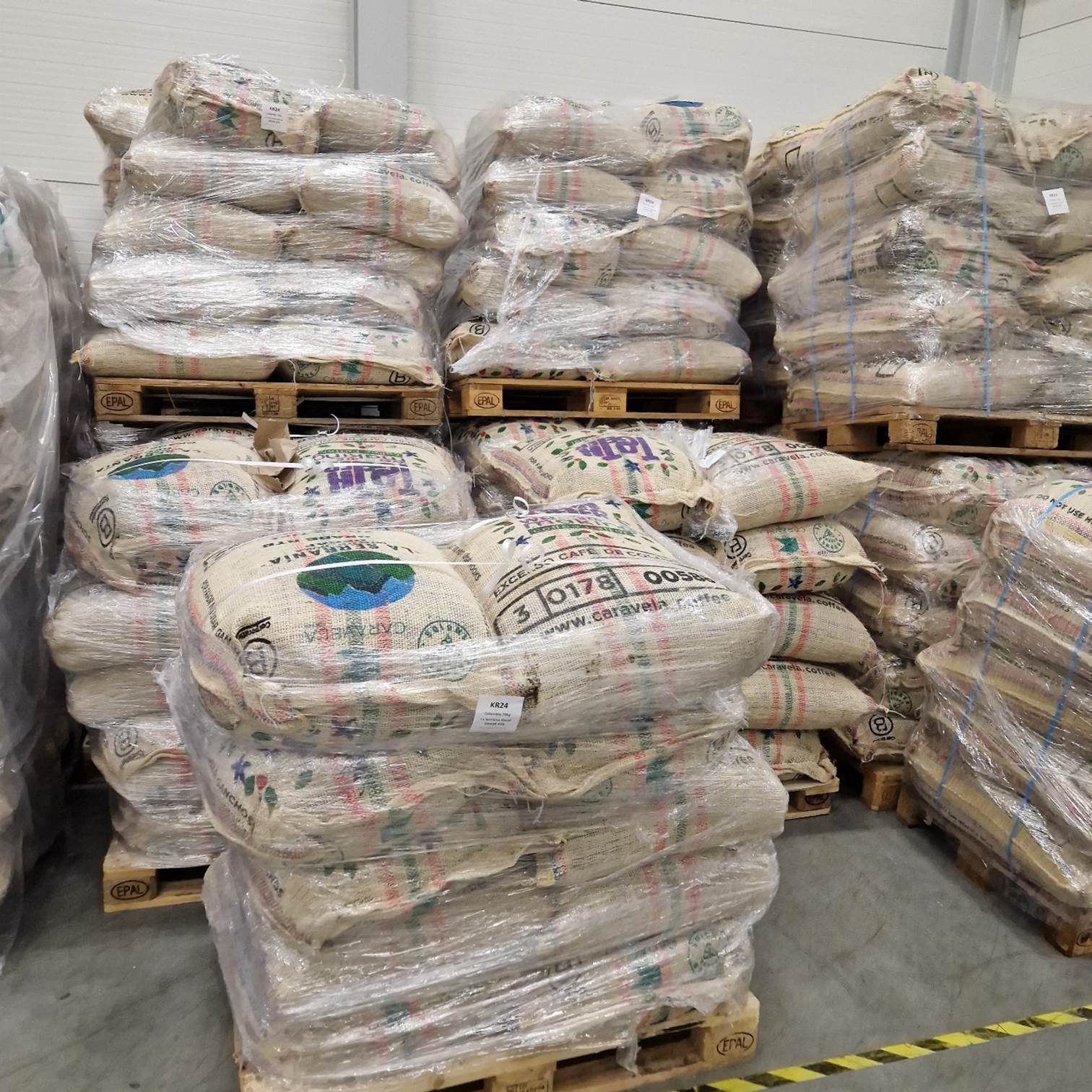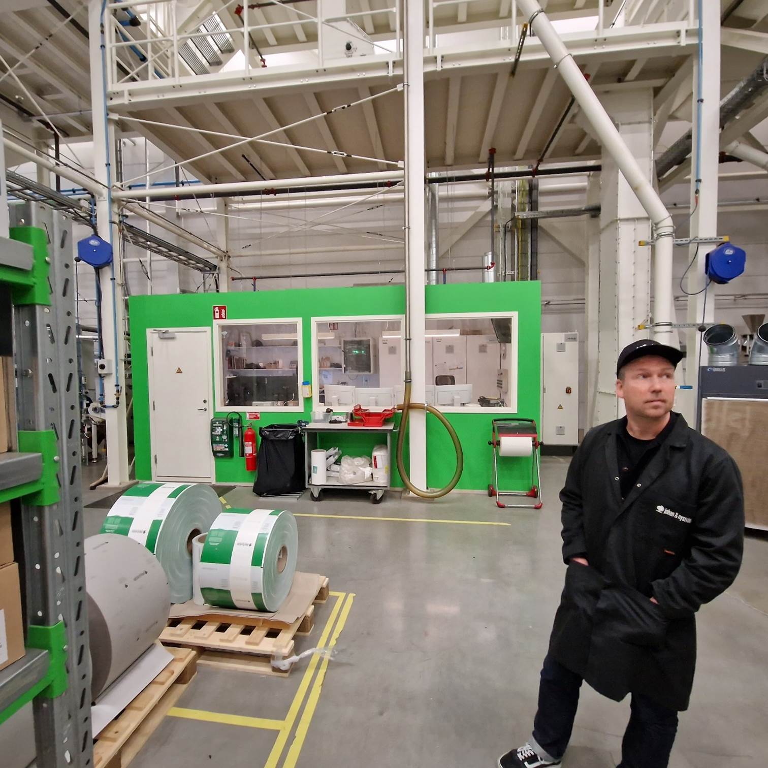 Gekleed in zwarte Johan & Nyström-petten en jassen is het nu tijd voor een rondleiding. Na het verplichte handen wassen in de "sluis" worden we verder geleid naar het magazijn en de branderij. In het eerste grote deel van de branderij bevinden zich de goederenontvangst en het ruwe koffiemagazijn. Het plafond is hoog en op pallets liggen stapels jutezakken uit alle hoeken van de wereld. Er hangt een intense geur in de lucht. "Dat is de ruwe koffie", zegt Jonas. Vroeger rook je in dit soort hallen ook de typische geur van jutezakken, maar tegenwoordig is de jute in de jutezakken niet echt jute meer...