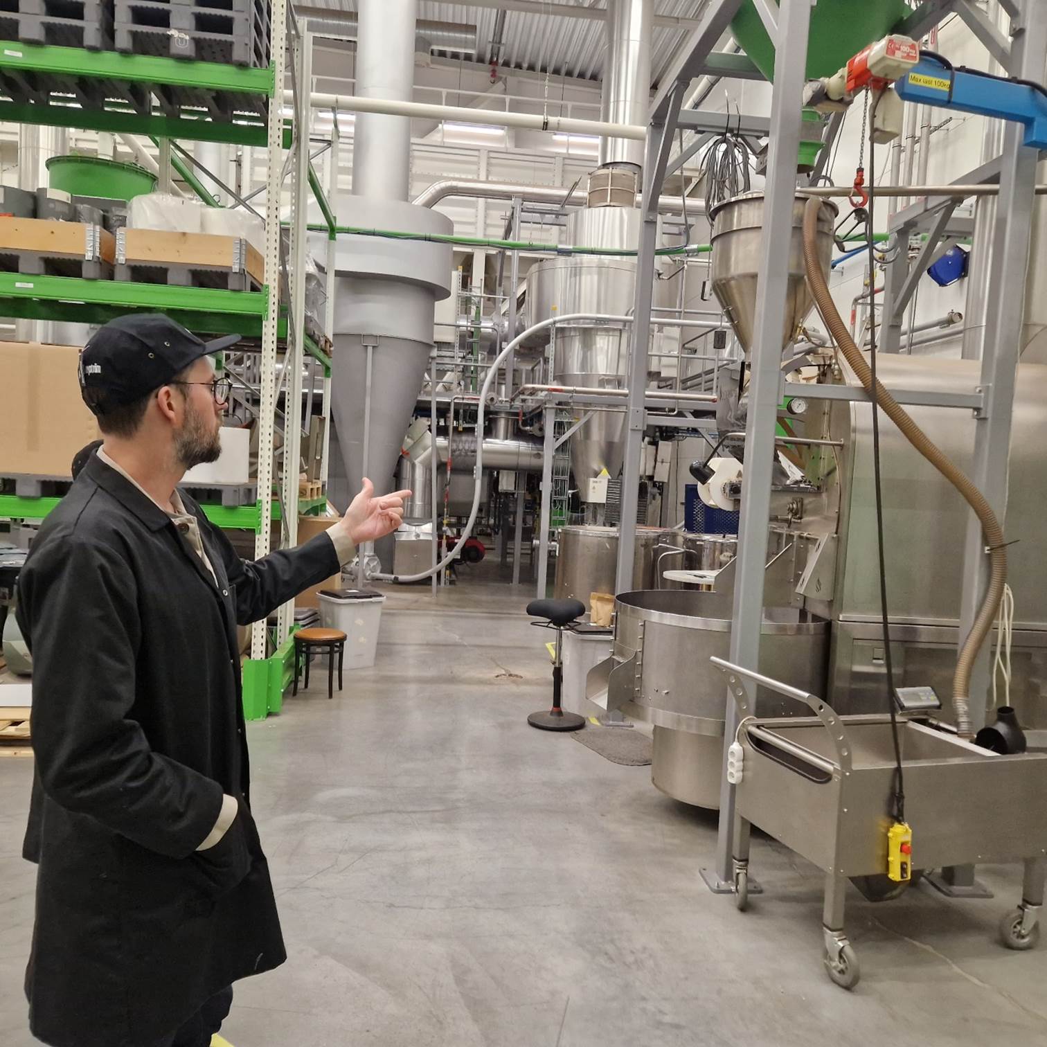 Op weg naar de branderij zelf stoppen we bij een paar kleurrijke zakken die cafeïnevrije koffie blijken te bevatten. Dit is in Europa nog niet zo groot als in de VS, maar het verdient toch een plaats in het assortiment van Johan & Nyström. Veel koffieverkopers die grote contracten hebben met andere merken, kopen hun cafeïnevrije koffie toch bij Johan & Nyström. Het wordt cafeïnevrij gemaakt met behulp van de "sugar cane"-methode, wat betekent dat ethylacetaat uit suikerriet wordt gewonnen, met water wordt gemengd en vervolgens worden de bonen in de mix geweekt. De cafeïne wordt onttrokken en het grootste deel van de koffiearoma's blijft behouden. Ethylacetaat klinkt 'gevaarlijk', maar is een variant van azijnzuur en komt onder andere voor in veel fruit, zoals bananen.