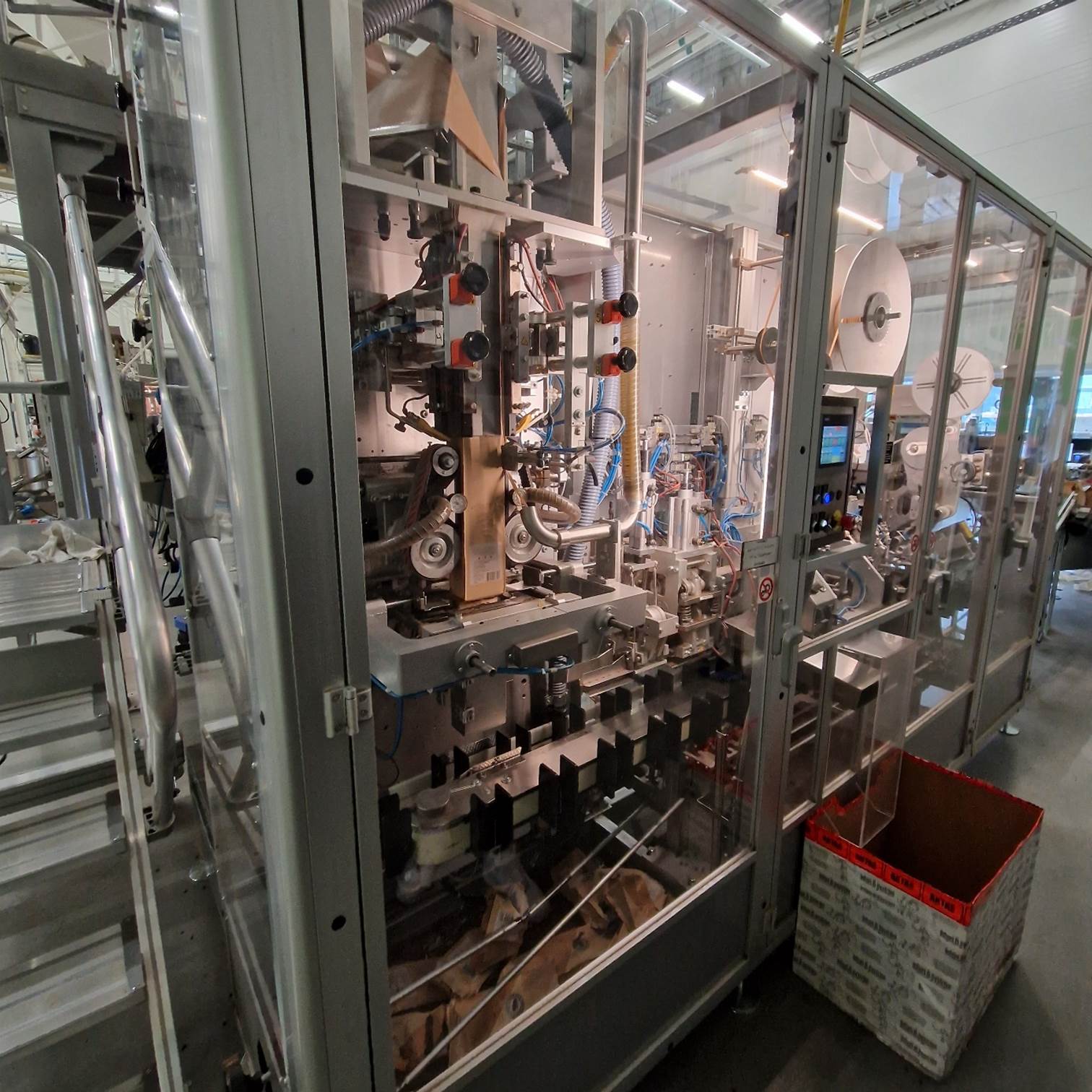 Wanneer de bonen zijn afgekoeld, worden ze verder getransporteerd in een buis in het plafond, waar ze door het systeem worden geleid in een grotendeels zuurstofvrije omgeving om oxidatie tot een minimum te beperken. Daarboven liggen de geroosterde koffiebonen te wachten om in de juiste zak te worden verpakt. Naast de verpakkingsmachine liggen rollen folie met de juiste bedrukking voor het juiste product. De rol wordt naast de machine gemonteerd en vervolgens worden de zakken één voor één gemaakt door de machine die de folie op de juiste maat snijdt en deze in de vorm van een zak aan elkaar las. De machine houdt de zak open en de buis wordt snel geopend en laat de juiste hoeveelheid bonen in de zak vallen, die vervolgens wordt gesloten en gecontroleerd om uiteindelijk verder te worden getransporteerd om zes per stuk in dozen te worden gelegd.