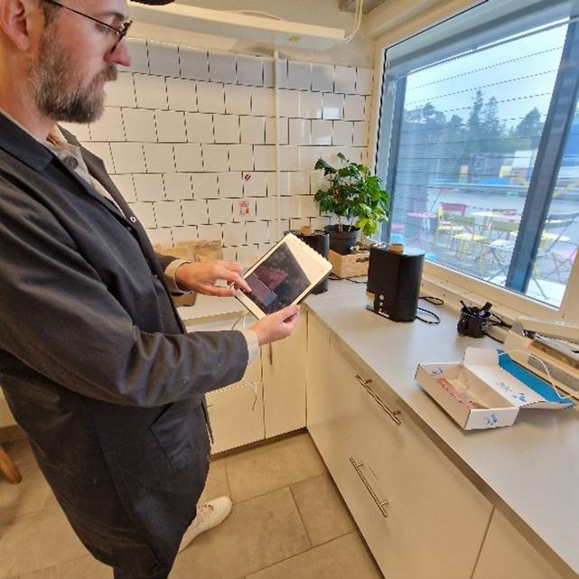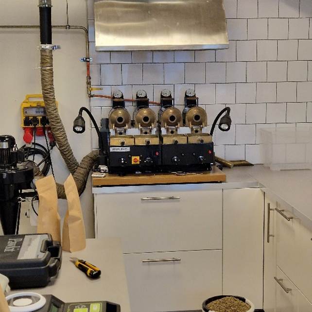 Vervolgens kijken we in de testruimte waar nieuw aangekomen ruwe koffie in kleine hoeveelheden wordt geproefroosterd en waar de roostmeesters experimenteren om de juiste temperatuurcurve en roostertijd te vinden. De resultaten worden vervolgens ingevoerd in de supercomputer die het commerciële roosteren regelt. Moderne miniroosters die worden bediend via iPads delen de ruimte met een oude trouwe dienstknecht (met pensioen, vermoeden we, maar hij siert zijn plek).