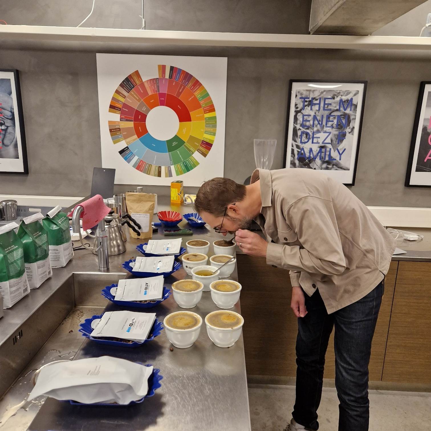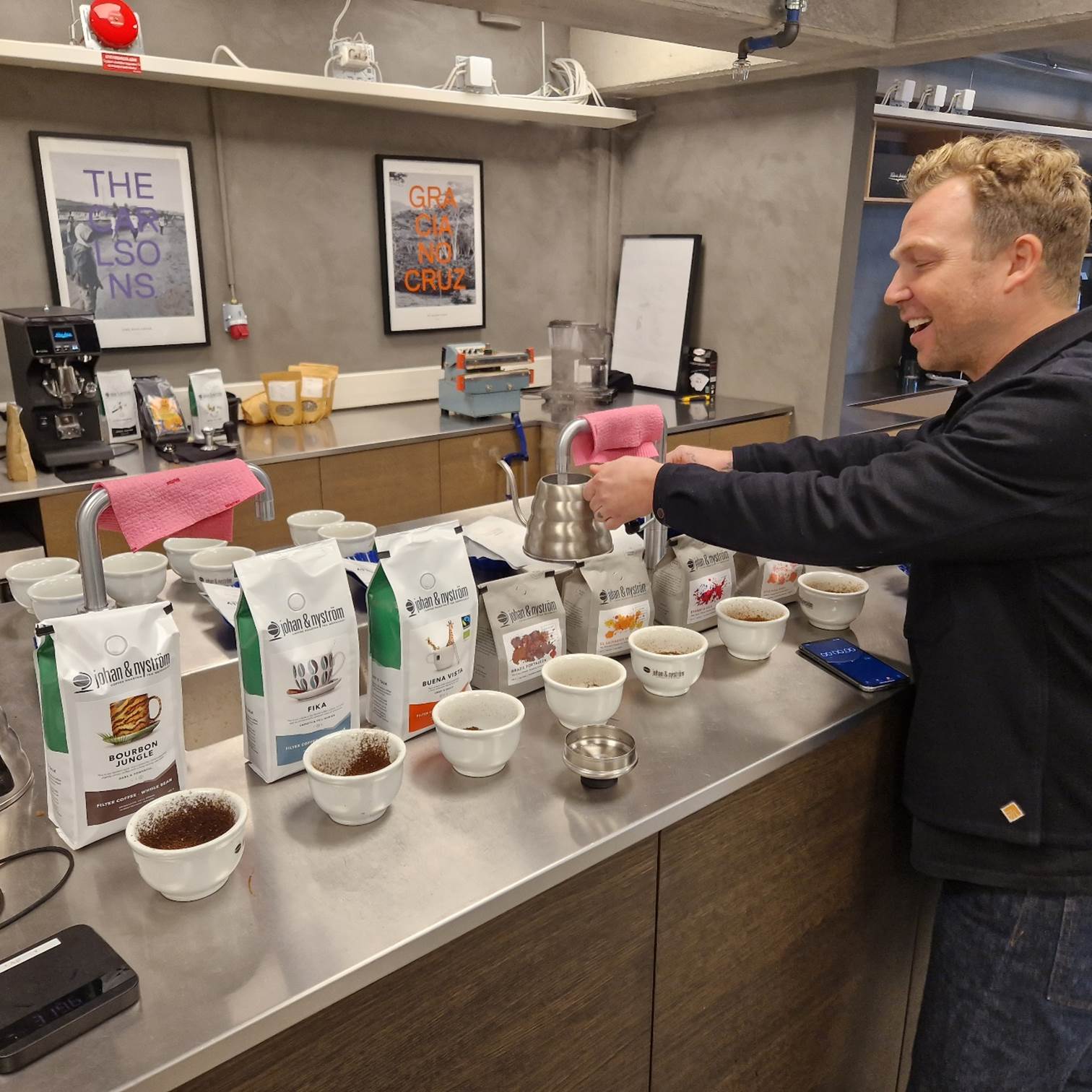 Na de rondleiding mogen we meedoen aan de "koppning". Koppning is de gestructureerde manier om kant-en-klare koffie te vergelijken. De procedure en bereiding van de koffie bij koppning is wereldwijd gestandaardiseerd en de smaakervaring is daarom precies hetzelfde, of je nu 'koppar' in een hut in Venezuela of in de voortreffelijke koffiestudio van Johan & Nyström in Länna.